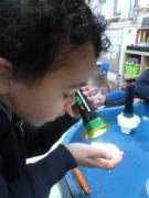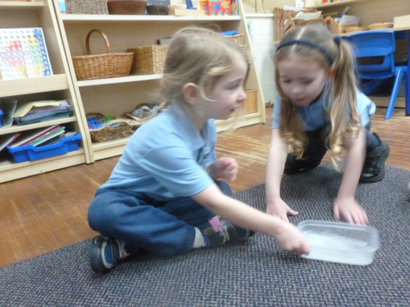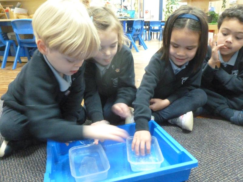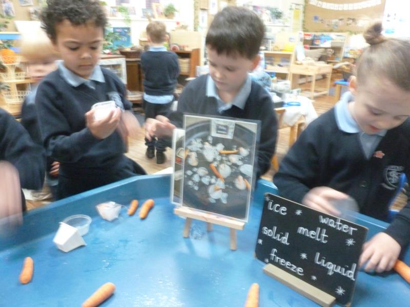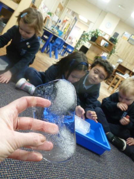 On Wednesday, we focused more closely on what ice feels like and continued developing our use of describing words. The children enjoyed learning about solids and liquids, as well as the process of freezing and melting. They were fascinated watching the ice slowly melt as the day went on.
