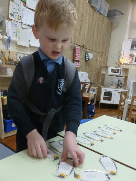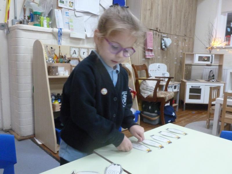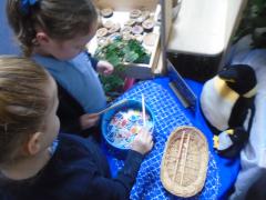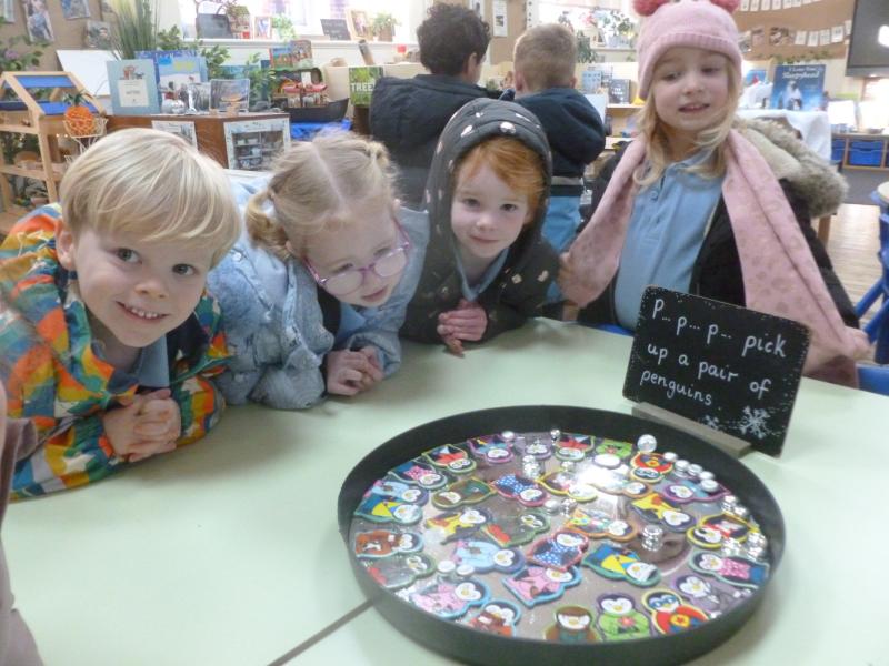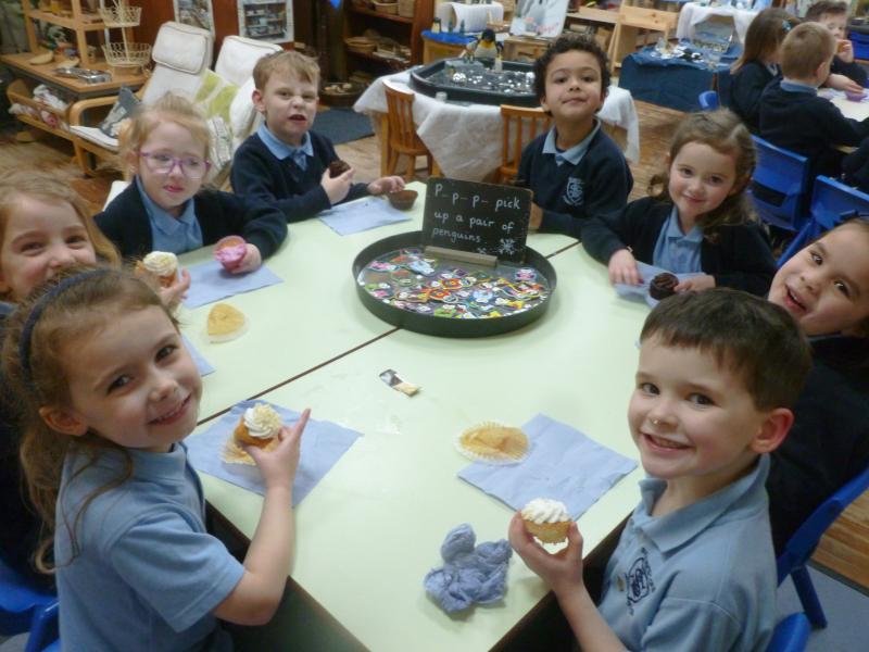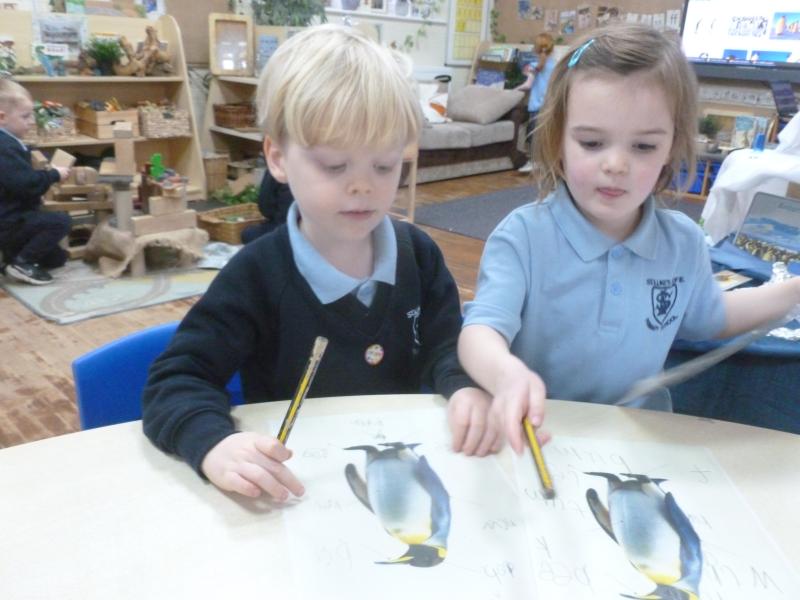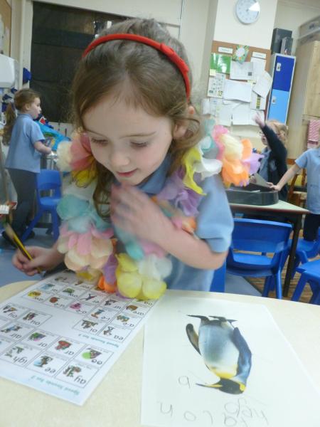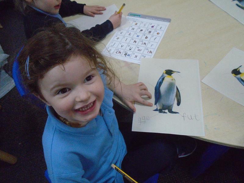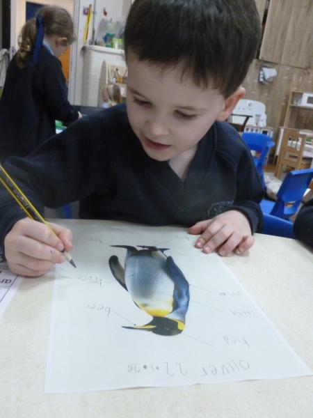 We compared the capacities of different containers and investigated how much water small, medium and large containers can hold. The children have loved filling and pouring this week. In the afternoon, we were very impressed with the children’s penguin labelling. They carefully pinched their Fred Fingers to find the sounds they needed to label parts of the Emperor Penguin.