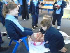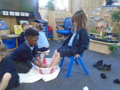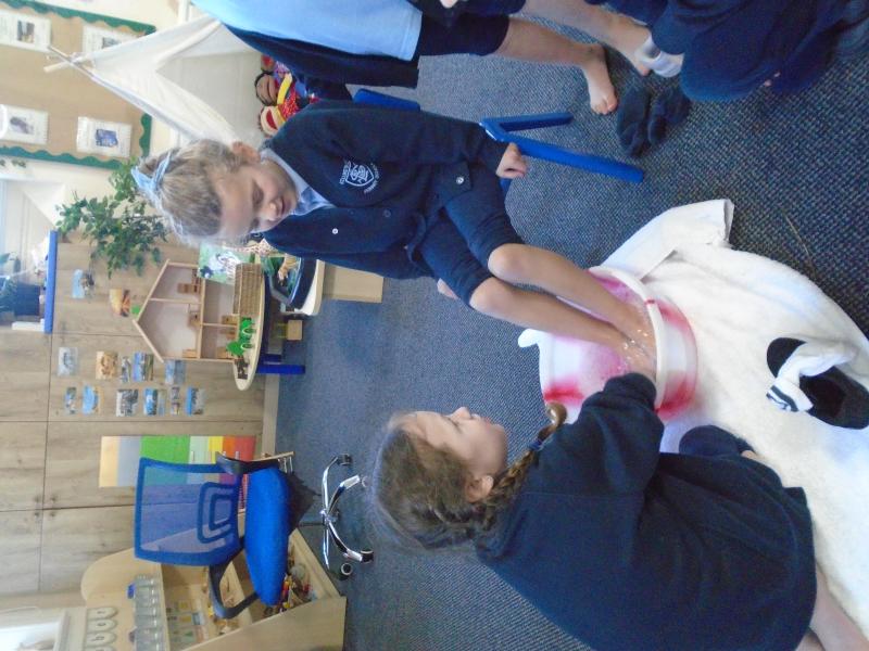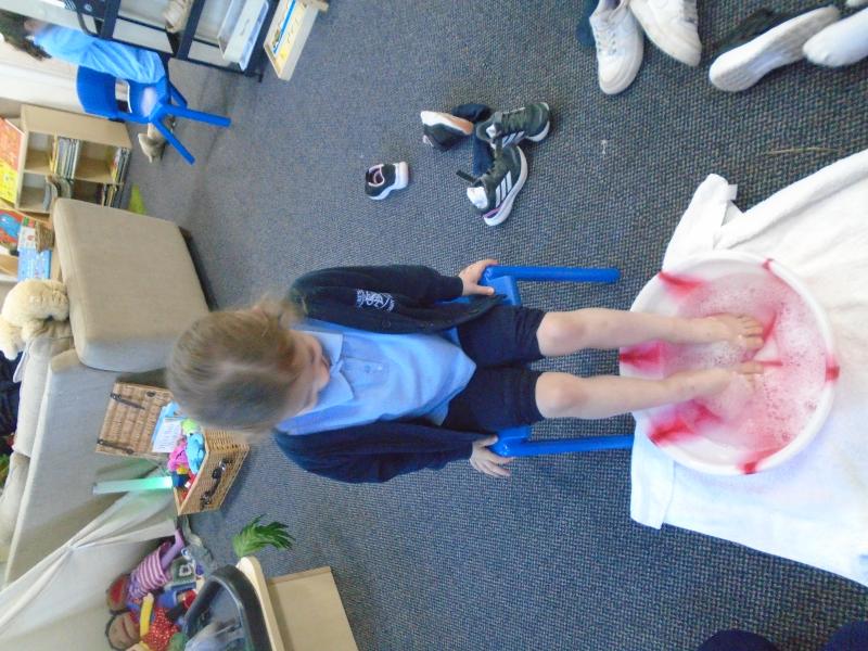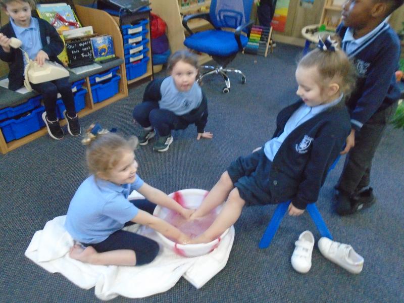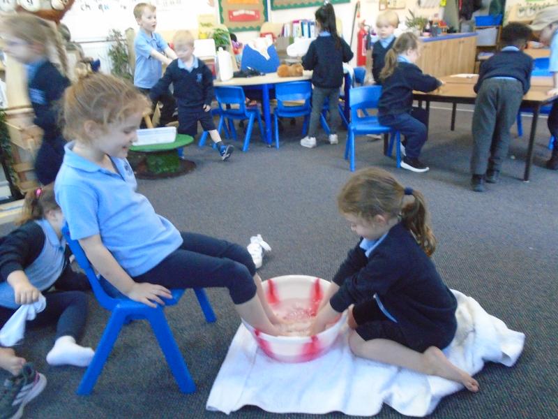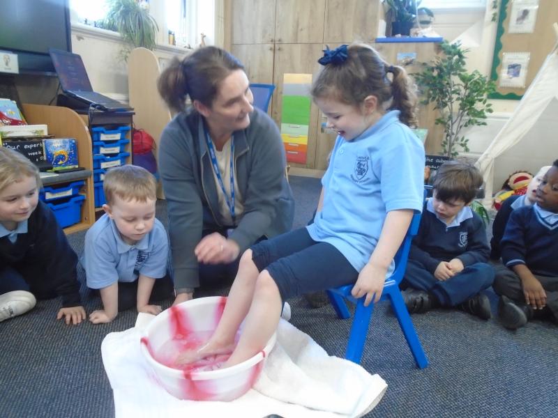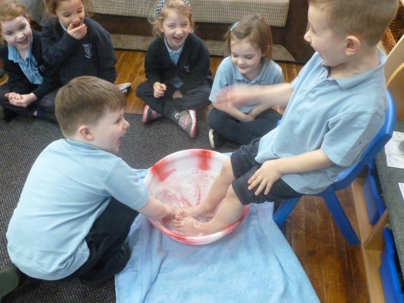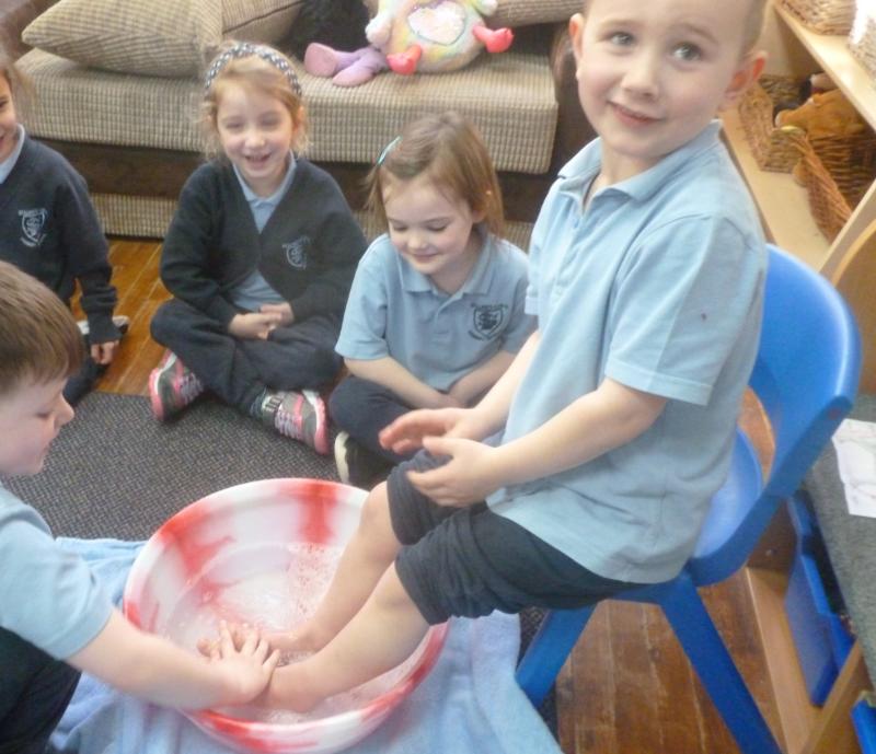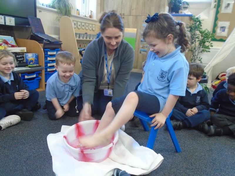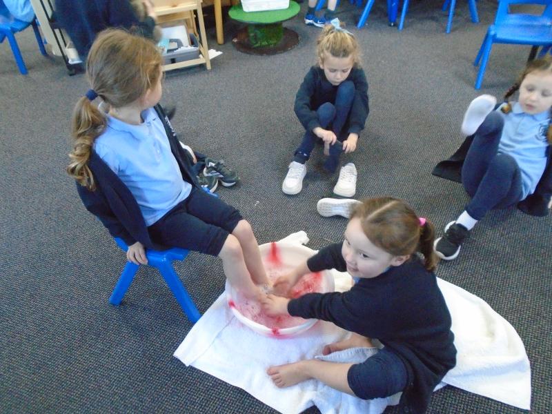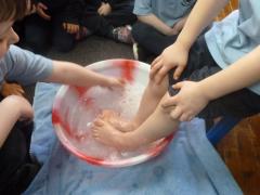 In the afternoon, we continued our learning about Easter. We explored the important Christian story of Jesus’ last meal with his disciples. On Holy Thursday (the Thursday before Easter), Christians remember the Last Supper, when Jesus shared bread and wine with his disciples. The children were very thoughtful when learning about how Jesus washed his disciples’ feet – they found it surprising that someone they saw as an important king would choose to serve others in such a humble way.