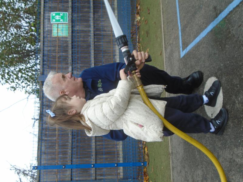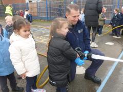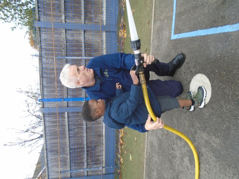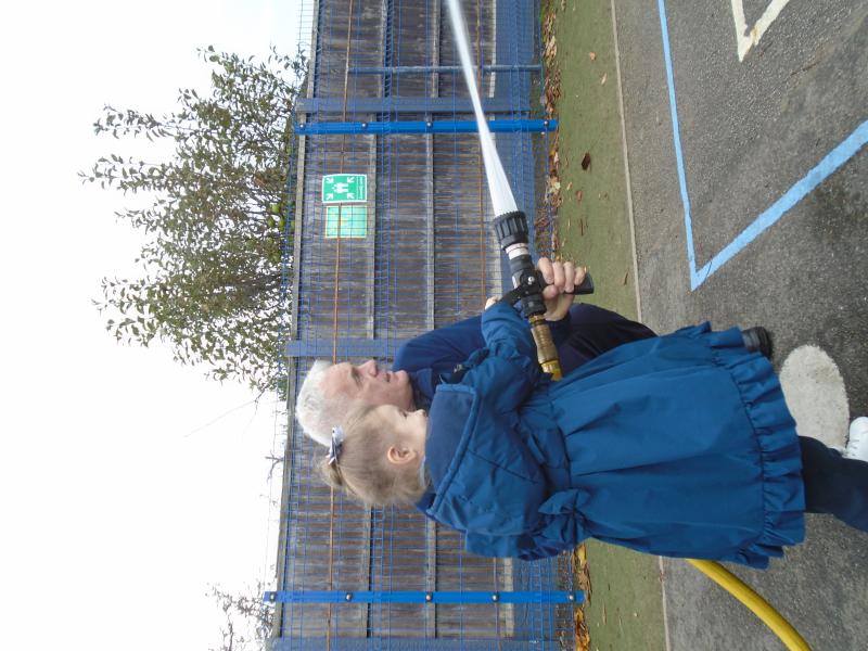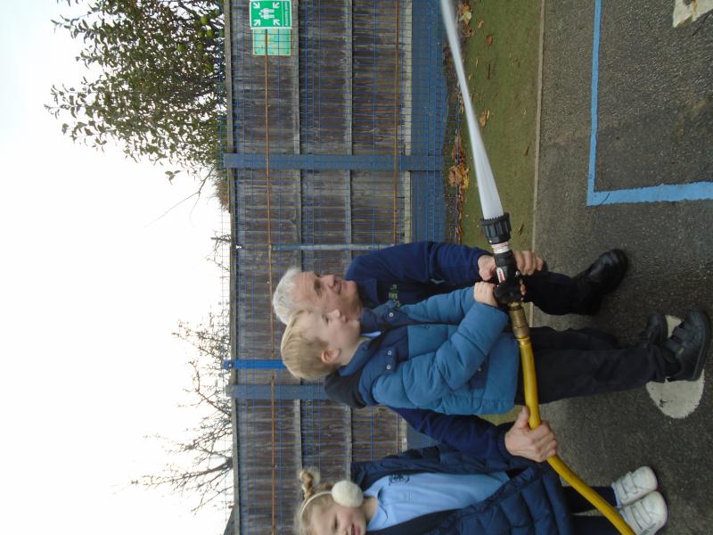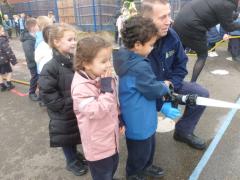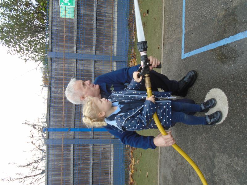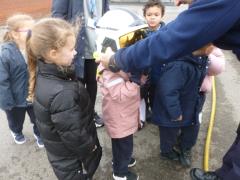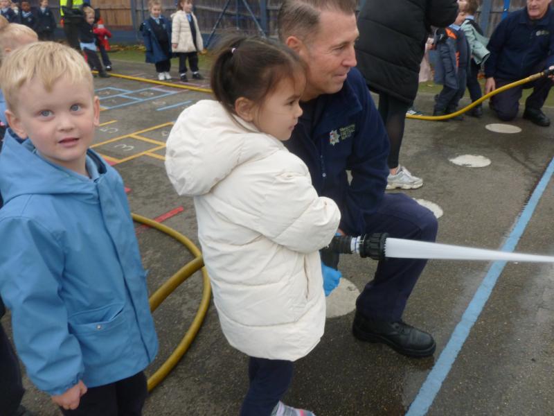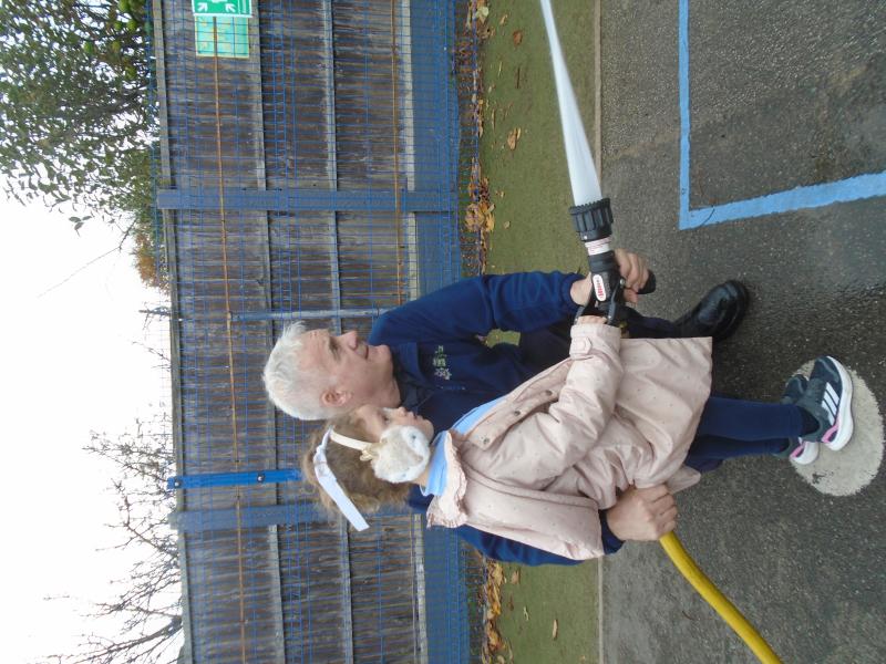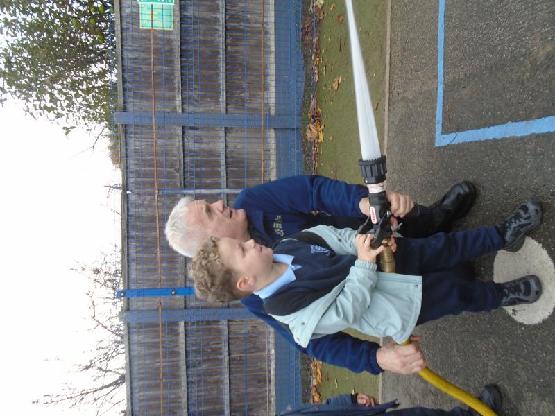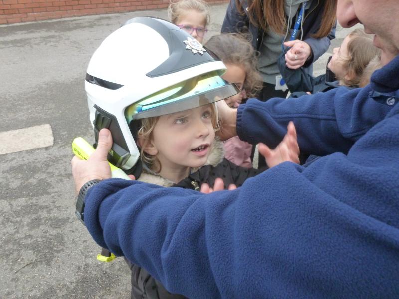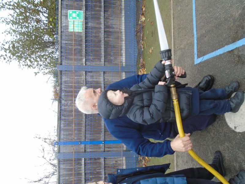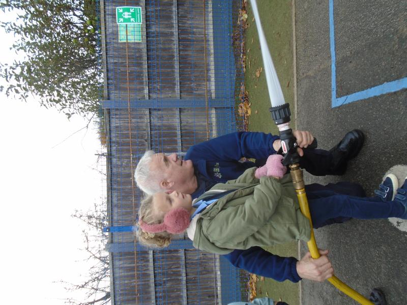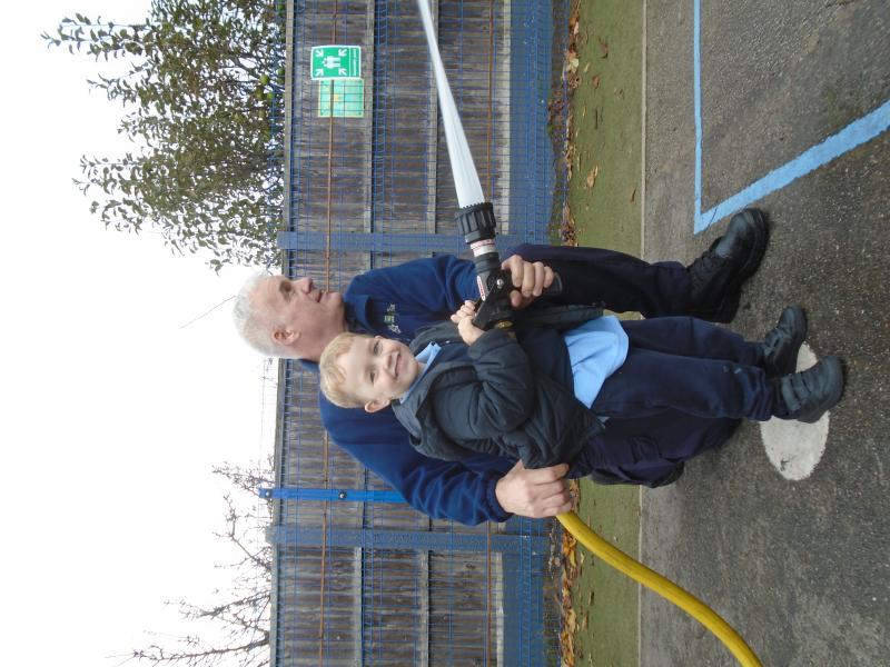 The crew showed us the fire engine and all the equipment they use — and everyone even got to have a go with the hose! The children enjoyed trying on the very heavy helmets and sitting in the fire engine before the crew were called out to an emergency.