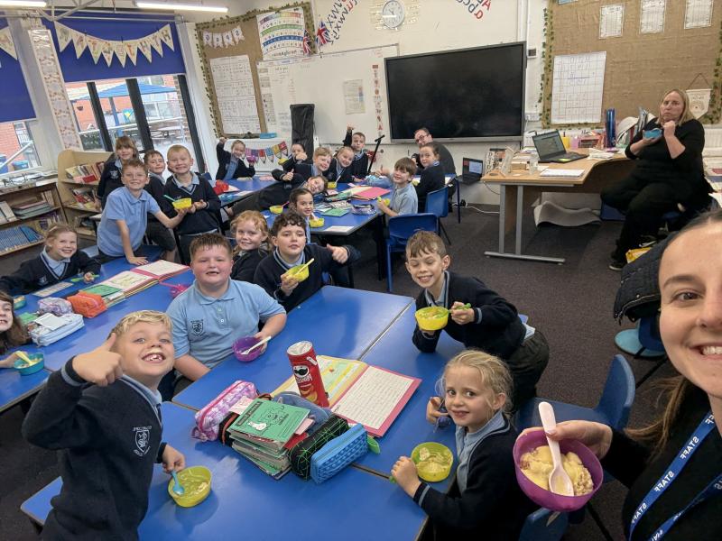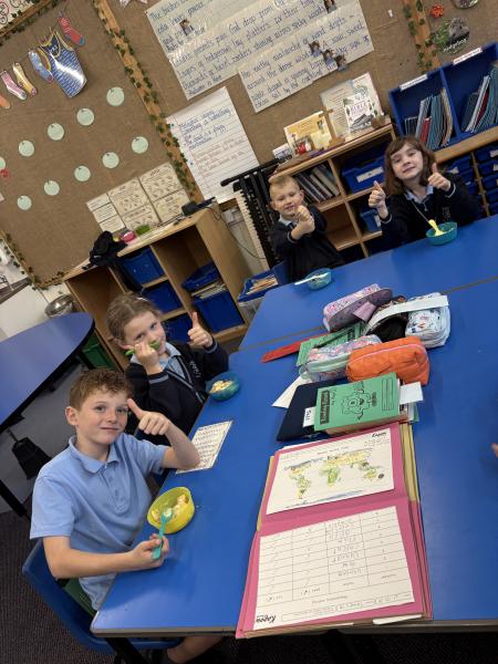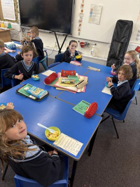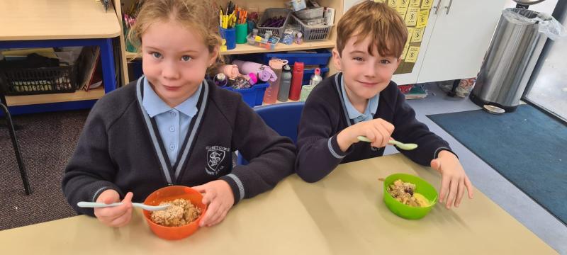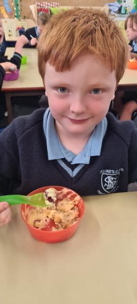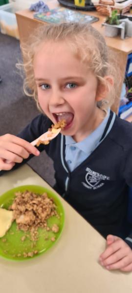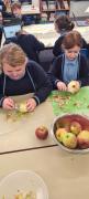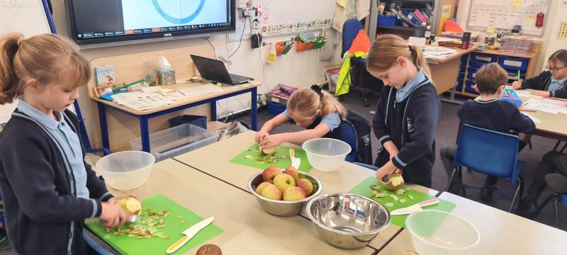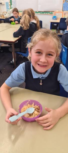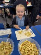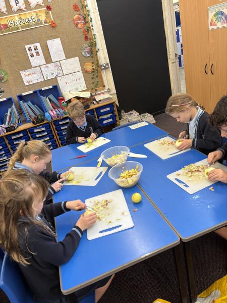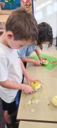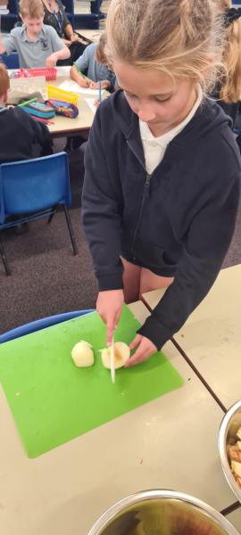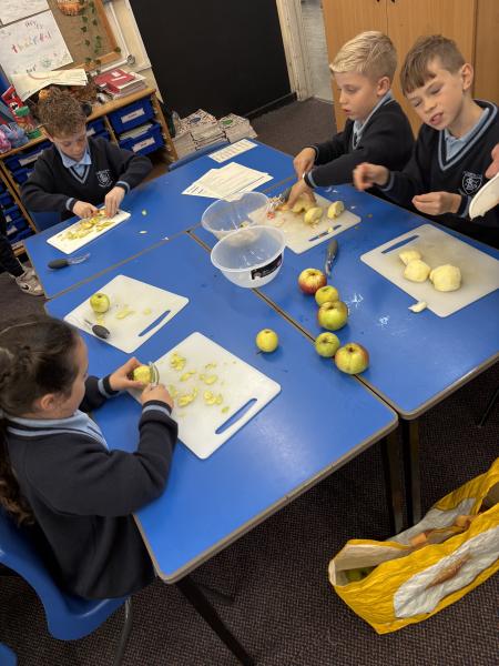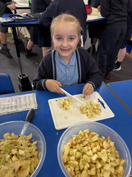 This week has been super fun, some children even saying it was ‘The best week ever!’ We started with learning about seasonal foods and why eating them is good for our environment (when we import them, the food miles cause global warming). With apples being a seasonal fruit, we developed our peeling and cutting skills and made a delicious apple crumble. We enjoyed this with some custard in class.