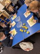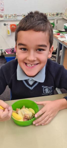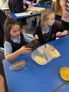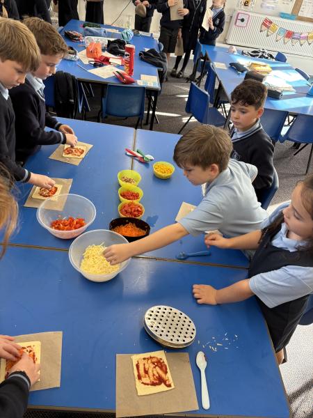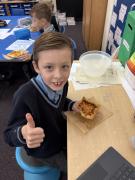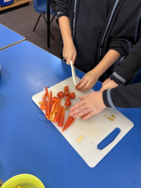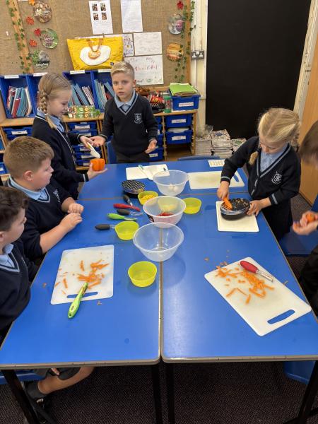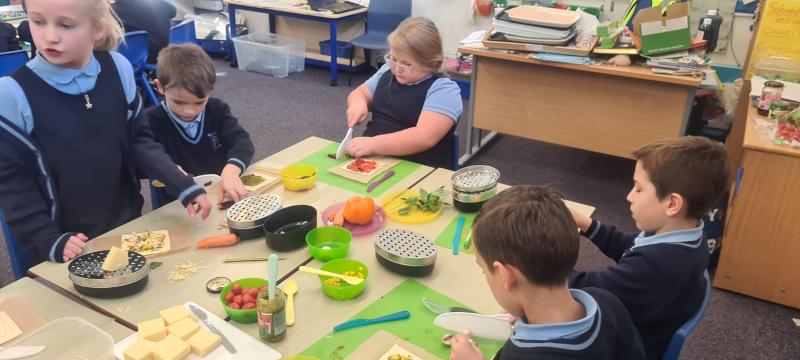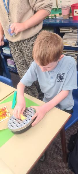After that, we broadened our seasonal food knowledge to vegetables and made tarts with puff pastry. As sweetcorn, mushroom, carrot and beetroot are seasonal vegetables, we chose 2 of these for our tart as well as a choice between tomato or pepper. We used pesto or tomato puree as our base and added cheese. We grated, chopped and peeled the vegetables ourselves! They had a 10/10 rating! However, through evaluation, the children did decide that they would probably change some things, like adding more cheese or not adding peppers.
